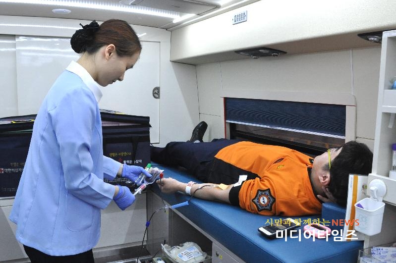 | 사랑의 헌혈 행사에 소방관 적극 참여 모습. <ⓒ미디어타임즈> |
