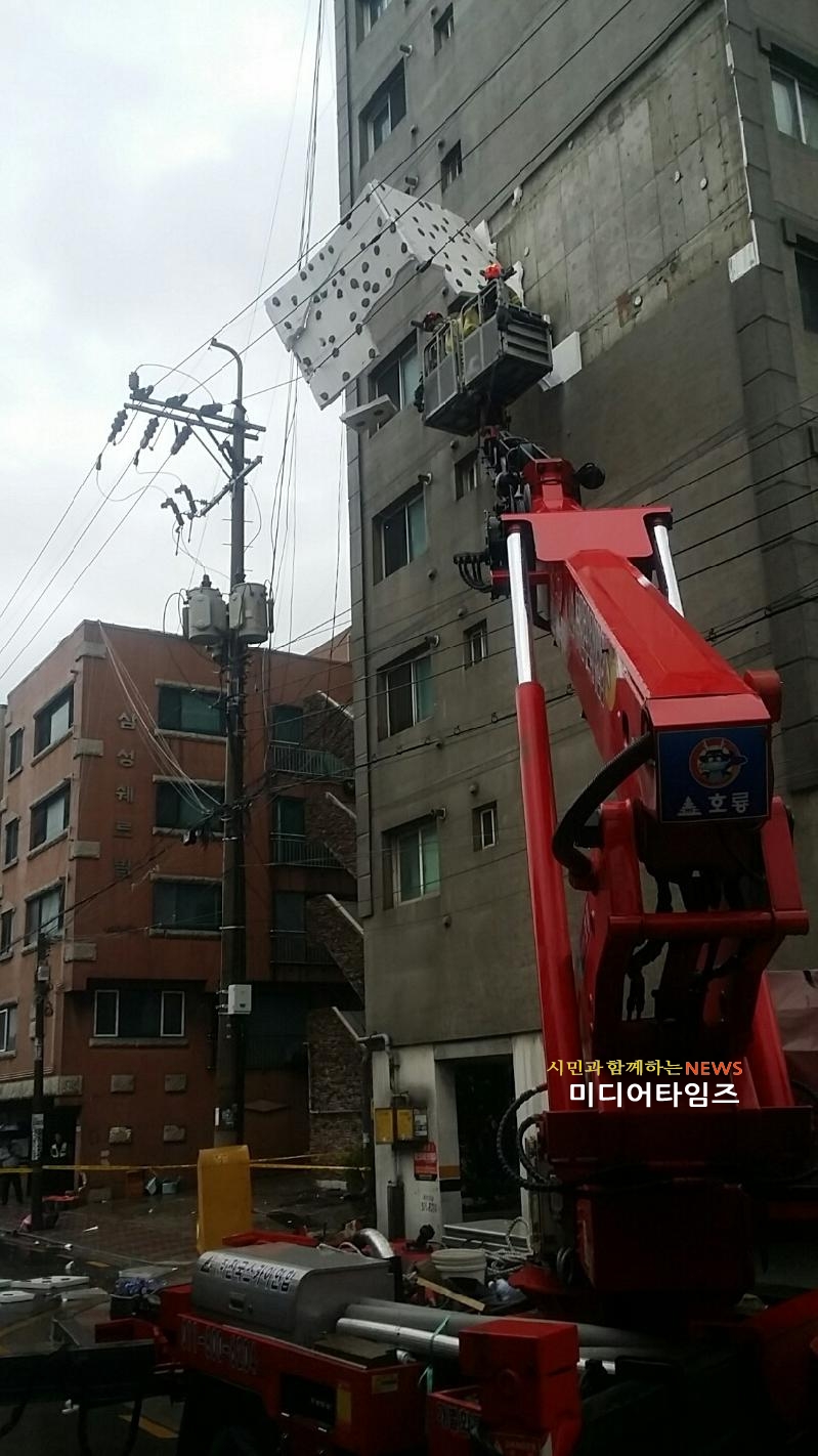 | 강풍에 의한 건물 외벽 철거 구조활동 모습. <ⓒ미디어타임즈> |