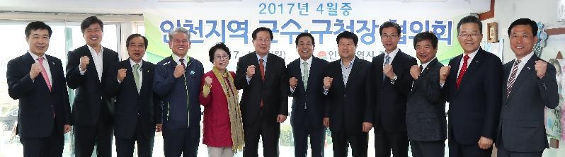 [미디어타임즈=문상수 기자] 인천 중구(청장 김홍섭)는 지난 17일 ‘2017년 4월중 군수·구청장 협의회’를 개최했다. 이번 회의에는 김홍섭 인천 중구청장을 비롯해 인천지역 군수·구청장 10명, 인천시 행정부시장 등이 참석하였다.이번 회의에서는 「시 공영주차장 관리이관」등의 사항을 인천시에 공동건의 하고 「2017 자유공원 문화관광 축제」, 「제28회 화도진 축제」홍보, 지난 협의회의 각종 건의사항에 대한 조치결과 보고 등을 논의하였다.한편, 매달 1회 개최되는 인천지역 군수․구청장협의회는 군․구 상호간의 친목과 유대를 도모하고 지방자치 단체간의 공통 현안사항에 대하여 충분하고 진지한 의견교환으로 지방자치단체의 고른 발전에 공헌하고 있다.