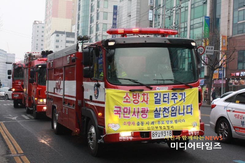 [미디어타임즈=문상수 기자] 부평소방서(서장 노경환)는 19일 소방차의 신속한 재난현장 접근성 향상을 위한 소방차 길 터주기 캠페인을 실시했다. 이 날 캠페인은 소방차 길 터주기의 대국민 공감대 확산과 안전문화 및 생명보호의식 향상을 위해 유관기관이 함께 참여해 부평구 관내 교통량이 가장 많은 부평대로와 장제로 일대를 선정하여 대열을 이뤄 주행하였고 가두안내방송을 통해 길 터주기 홍보활동도 전개하였다.소방서 관계자는 “긴급차량 통행 시 우측 가장자리에 일시 정지 또는 양보 운전등을 통하여 소방차량 길 터주기에 시민들이 적극적으로 협조해 줄 것”을 당부했다.