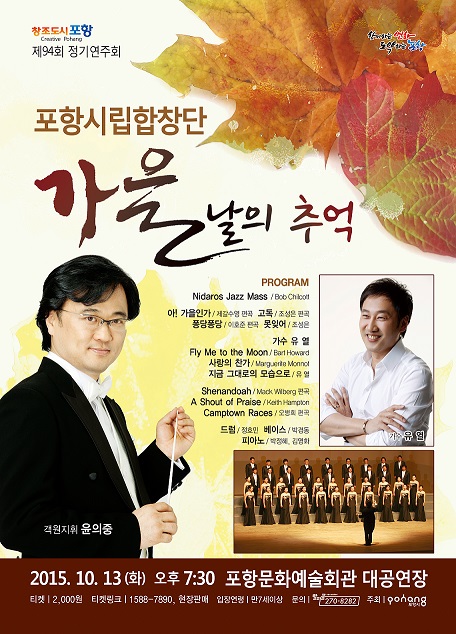 포항시립합창단(단장 이재춘)은 오는 10월 13일(화) 오후 7시30분 포항문화예술회관에서 포항시립합창단 “가을날의 추억”이 공연된다. 이번 공연은 국내 정상급 지휘자 윤의중(한세대 교수)의 객원지휘로 한 단계 업그레이드 된 포항시립합창단의 사운드를 즐길 수 있는 공연을 선보일 계획이다. 서울대학교 음악대학에서 바이올린을 전공한 후 미국 신시내티 음악대학원에서 지휘 박사학위를 취득한 윤 지휘자는 국제적인 명성의 지휘자 윤학원의 아들로 2004년부터 현재까지 독일 브레멘, 오스트리아 그라츠, 미국 신시내티, 중국 베이징, 싱가포르 등 세계 합창 콩쿨의 심사위원으로 활약하고 있으며 자타가 공인하는 한국 정상급 지휘자이다. 미국에서 유학한 지휘자답게 첫 번째 무대는 밥 칠콧 작곡의 니다로스 재즈 미사를 올리고, 이어서 새롭게 편곡한 한국 가곡을 연주한다.