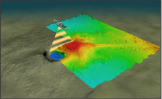 | 다중빔음향측심기를 이용한 수심측량 모식도<미디어 타임즈> |
