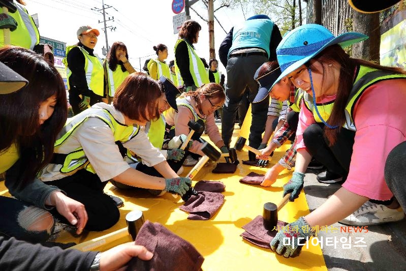 [미디어타임즈=문상수 기자] 인천 동구(구청장 이흥수)는 24일 오전11시경 서흥초교, 서림초교 정문 앞 횡단보도 2개소에 어린이 교통사고 예방을 위한 옐로카펫을 설치했다.옐로카펫은 초등학교 주변 횡단보도 대기공간인 인도와 벽에 삼각형 모양의 노란색 알루미늄 스티커와 태양광 램프를 설치해 횡단보도 진입부에 있는 어린이들을 보호하는 교통안전시설이다.동구는 초록우산 어린이재단인천지역본부, 서흥초등학교, 서림초등학교, 후원 기업인 현대제철 노동조합 등 관련 기관과 사전협의를 통해 옐로카펫 설치 장소를 선정했으며 설치 전 학부모들에게 사업설명회도 개최했다.이날 서흥초교 옆 횡단보도 등 2개소에 조성된 옐로카펫은 동구에 처음으로 설치된 것으로 구남회 부구청장을 비롯해 박은숙 초록우산인천지역본부장, 서흥초교 및 서림초교 학부모, 현대제철 노동조합 직원 등 40여명이 참여해 고무망치를 두드려가며 설치를 완료했다.한편 이흥수 동구청장은 “아동친화도시 조성을 위한 옐로카펫 설치로 어린이 보호구역 내에서 교통사고 발생이 줄어들 것으로 기대한다”며 “금년에는 옐로카펫을 더 많이 확대 설치해 어린이와 학부모가 안심할 수 있는 통학 환경을 조성하겠다”고 말했다.