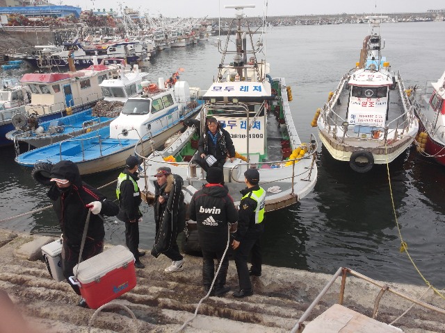 | 홍원항(충남 서천군)에 입항한 낚시어선을 해양경찰이 안전관리를 하고있다 |