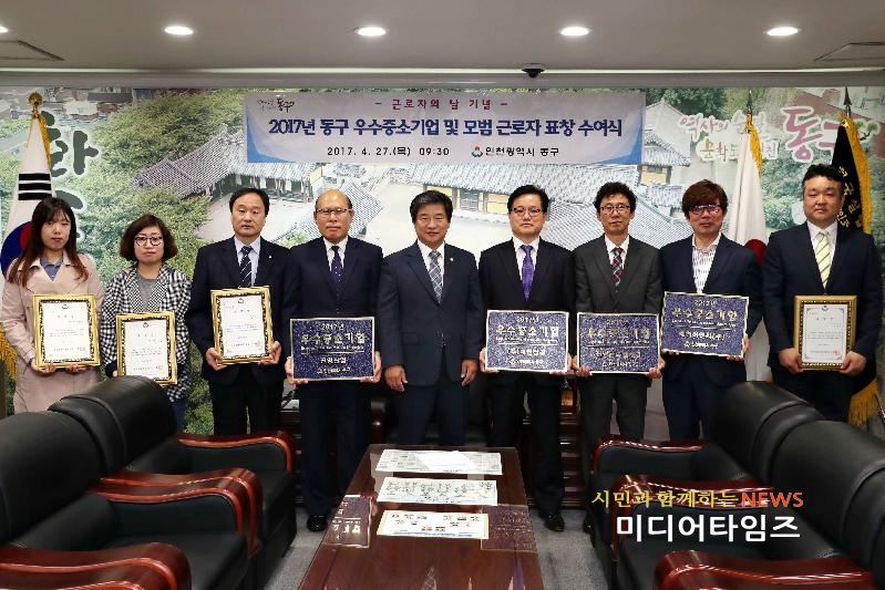 [미디어타임즈=문상수 기자] 인천 동구(구청장 이흥수)는 27일, 접견실에서 우수 중소기업 4곳과 모범근로자 4명에 대해 구청장 표창을 수여했다.구에 따르면 이번 표창은 5월 1일 근로자의 날을 맞이해 기술개발 및 판로개척 등 지역경제 발전에 이바지한 우수기업과 산업 현장에서 숨은 일꾼으로서 노사협력 증진과 기업의 생산성 향상에 기여한 모범근로자들의 공로를 치하하고자 마련됐다.이날 시상에서 우수중소기업 표창에는 ㈜재인정공(대표:정영규), 진영산업(대표:이건욱), 진명금속열처리(대표:조승훈), 해천이엔씨(주)(대표:황민식)이 수상했고, 모범근로자 표창에는 세원필텍 이준원, 제이에스라이팅(주) 오영숙, 한밭로지스틱스팩(주) 김소현, 한진기계 송재현이 수상했다. 수상기업에게는 우수기업 현판수여, 국내·외 전시회 참가지원 등의 특전이 주어진다.한편 이흥수 구청장은 “어려운 경제 환경에서도 꾸준한 기술개발로 기업의 경쟁력 제고는 물론 지역경제 발전, 근로자의 복지증진 및 좋은 일자리 창출에 최선을 다해 준 기업과 근로자들에게 감사드린다”며 “앞으로도 동구의 지역경제 발전에 최선을 다해달라”고 당부했다.