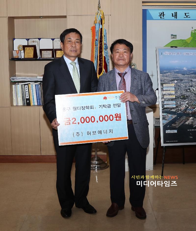 [미디어타임즈=문상수 기자] 중구 월디 장학회(이사장 김홍섭)는 지난 26일 (주)허브에너지 김원배 대표가 중구 월디장학회에 200만원을 장학금으로 기탁했다. 장학금 기탁식에는 김홍섭 중구청장을 비롯해 (주)허브에너지 김원배 대표 외1인 및 월디장학회 관계자등 10여명이 참석한 가운데 진행됐다.(주)허브에너지 김원배 대표는 이번 200만원 기탁을 시작으로 향후에도 중구 인재 육성과 어려운 환경 속에서도 배움의 뜻을 가지고 있는 학생들에게 희망 과 용기를 주고자 장학 사업에 계속 동참하겠다고 약속했다.한편 김홍섭 월디 장학회 이사장은 지역 발전에 이바지 하고 있는 (주)허브에너지 김원배 대표에게 감사의 인사를 전하면서 기탁금은 “중구 인재 양성을 위해 소중하게 활용하겠다.”고 하였다.