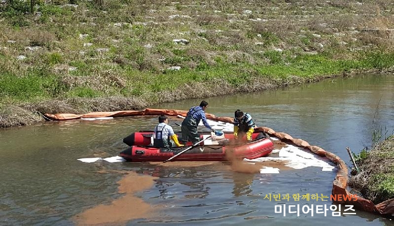 | 인천 서구, 하천 수질오염사고 대비 시·구 합동 가상 방제훈련 모습. <ⓒ미디어타임즈> |
