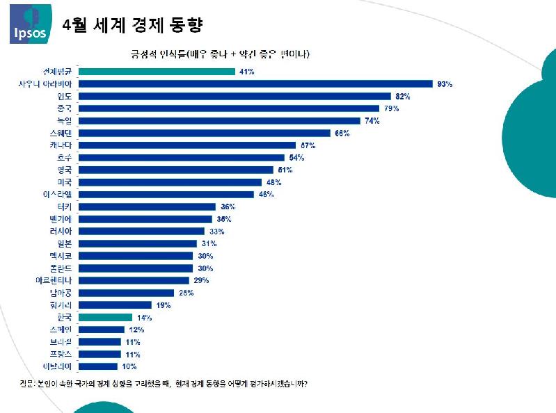 입소스(Ipsos)가 전 세계 25개국 1만 7,500명을 대상으로 실시한 ‘세계 경제동향 인식조사’에 따르면, 세계인이 평가한 2015년 4월 경제에 대한 긍정 인식률이 지난달 비교 2%포인트 소폭 상승한 41%로 나타났다. 한국은 지난달 비교 1% 소폭 상승하였지만, 10%의 경제 신뢰도 범위에서 계속 정체되어있는 추세이다. 국가별 경제동향 인식을 살펴보면, 사우디 아라비아(93%, +1%p)의 자국 경제동향에 대한 긍정적인 평가가 가장 높았으며, 그 뒤를 이어, 인도(82%, +2%p), 중국(79%, +4%p) 순이다. 반면, 자국 경제에 대한 가장 부정적인 평가를 보인 국가는 이탈리아(10%, +1%p)이며, 프랑스(11%, +2%p), 브라질(11%, ±0%p), 스페인(12%, -1%p)이 다음 순이다. 한국은 하위 5위로 부정적 평가가 높은 국가 그룹에 속한다. 주요 대륙별 경제동향 인식을 살펴보면, 가장 높은 경제 신뢰도를 보인 지역은 북미(53%, -1%p)이고, 가장 부정적 평가 지역은 남미(23%, +6%p)로 나타났다. 지난 달에 비해 상승폭이 가장 큰 국가는 14%포인트 상승한 멕시코(30%)이다. 미국 경기회복 효과로 멕시코 경제가 최대폭 상승하였으며, 멕시코의 자동차 생산시장이 세계 자동차 회사들의 각축장이 되면서 한국을 포함한 유럽과 일본 자동차의 투자로 자국 경제에 대한 낙관적인 인식과 함께 긍정적인 예측을 보이고 있다. 반면, 하락폭이 가장 크게 나타난 국가는 벨기에(-6%p, 35%)로 이슬람 테러위협으로 인한 우려로 부정적인 인식을 보였다. 6개월 후 경제 전망을 살펴보면, 인도(59%, -8%p)가 자국 경제 성장에 대한 기대가 가장 높은 반면, 가장 부정적인 전망을 보인 국가는 프랑스(7%, +2%p)이다. 한국(12%, +3%)은 부정적인 평가가 높은 4위 국가로 자국의 경제동향 인식뿐 만 아니라, 6개월 후 경제 전망에 대해서도 밝은 인식을 갖고 있지 않은 것으로 나타났다.