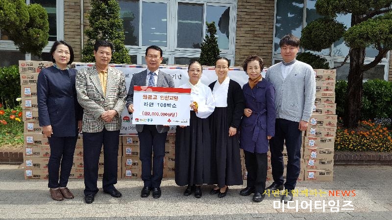 | 원불교 인천교당 불우이웃돕기 라면 100박스 기탁 사진. <ⓒ미디어타임즈> |