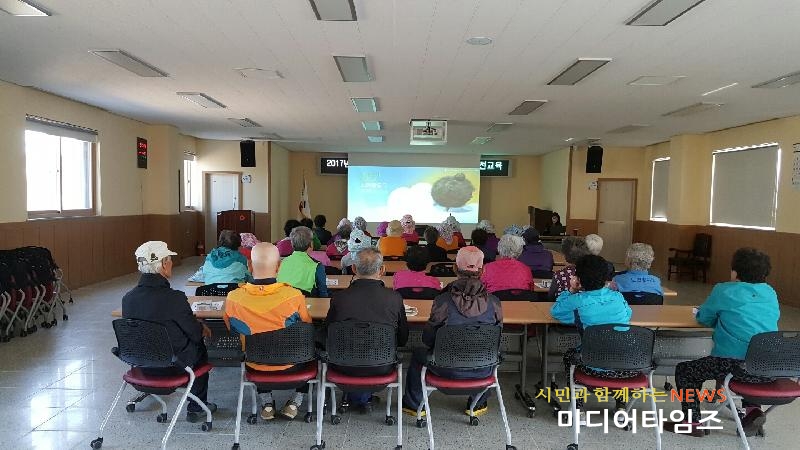 | 어르신들의 건강한 사회활동참여를 위하여 미세먼지,교통안전 교육을 하는 모습. <ⓒ미디어타임즈> |