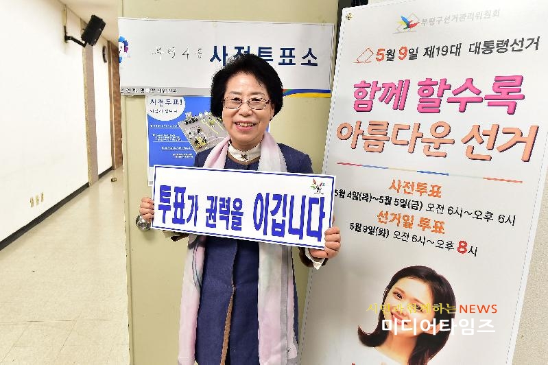 [미디어타임즈=문상수 기자] 홍미영 부평구청장은 4일 오전 8시 50분 부평구청 지하 상황실에 마련된 ‘19대 대통령선거 부평4동 사전투표소’를 찾아, 투표에 앞서 구청 국장단과 함께 투표 참여를 독려하는 행사를 가졌다.홍미영 구청장은 “투표가 권력을 이깁니다”란 문구가 적힌 손 팻말을 들고 자치행정국장 등과 함께 기념 촬영을 한 뒤 사전 투표를 했다.홍미영 구청장은 “모든 유권자들이 국민의 권리인 투표권을 꼭 행사해 투표가 권력을 이기는 모습을 보여줄 것”을 당부했다.