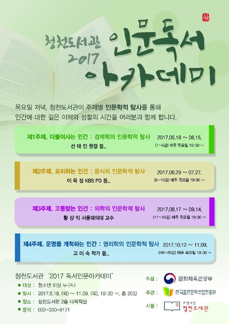 [미디어타임즈=문상수 기자] 부평구(구청장 홍미영) (재)부평구문화재단은 오는 18일부터 11월 9일까지 청천도서관에서 인문도서 읽기를 통한 지역 독서문화 확산을 위해 ‘2017 인문독서아카데미’를 운영한다.‘2017 인문독서아카데미’는 문화체육관광부가 주최하고 한국출판문화산업진흥원이 주관하는 공모사업으로, 전국 60개 도서관 가운데 부평구에서는 청천도서관이 유일하게 선정됐다.청천도서관은 이 기간 중 매주 목요일 오후 7시 30분부터 120분간 총 20회에 걸쳐 경제학, 음식학, 의학, 명리학과 관련된 4개의 주제별 전문가 특강을 진행한다. 첫 번째 강좌는 ‘더불어 사는 인간-경제학의 인문학적 탐사’를 주제로 18일부터 6월 15일까지 선대인경제연구소 선대인 소장 등이 2017년 한국경제 흐름과 일자리의 미래를 예측해본다. 두 번째 주제는 ‘요리하는 인간-음식의 인문학적 탐사’를 내용으로 6월 29일부터 7월 27일까지 박정배 음식칼럼리스트가 역사 속 요리하는 인류와 음식의 사회학에 대하여 이야기를 나눈다. 다음엔 ‘고통 받는 인간-의학의 인문학적 탐사’를 주제로 문명과 질병의 변천사와 인간의 대응을 주제로 전문가 특강이 진행된다.마지막으로 ‘운명을 개척하는 인간-명리학의 인문학적 탐사 강좌가 10월 12일부터 11월 9일까지 열린다.프로그램의 참가비는 무료이며, 참여를 원하는 사람은 청천도서관을 방문하거나 전화(☎330-9171~3)로 접수하면 된다. 희망자에 한해 총 5개의 강좌 중 80% 이상 출석 시 수료증이 전달된다. 자세한 사항은 부평구립도서관 누리집(www.bppl.or.kr)에서 확인하면 된다. 문의 : 청천도서관(☎330-9171).