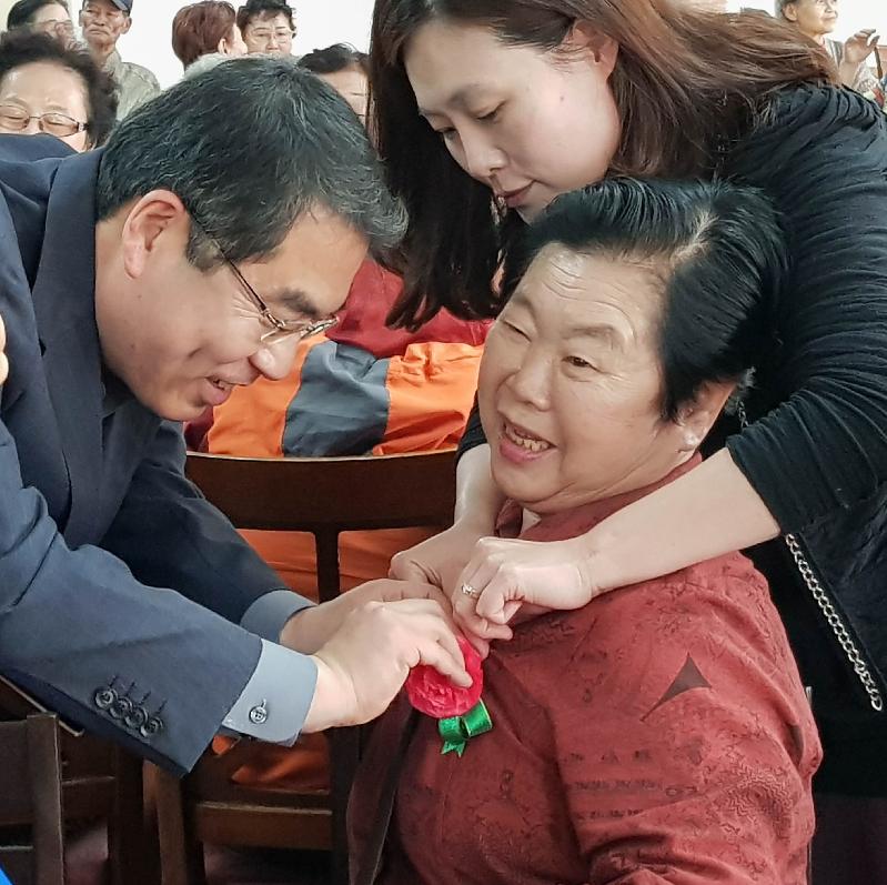| 양기대 광명시장이 8일 하안종합사회복지관에서 열린 어버이날 기념행사에 참석해 어르신들께 감사의 카네이션을 달아드리고 있다, |