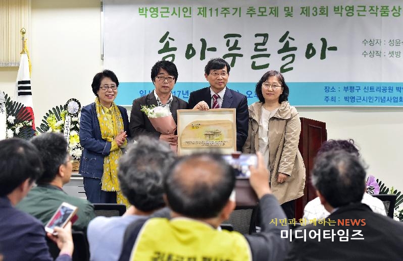 [미디어타임즈=문상수 기자] 가수 안치환의 대표 노래 중 하나인 ‘솔아 솔아 푸르른 솔아’의 원작시를 쓴 작가로 널리 알려진 ‘박영근 시인 제11주기 추모제 및 제3회 작품상 시상식’이 지난 13일 오후 홍미영 부평구청장 등이 참석한 가운데 부평구청 상황실에서 열렸다.1958년 전북 부안에서 태어난 박영근 시인은 1981년 ‘반시’ 6집에 ‘수유리에서’ 등을 발표하며 작품 활동을 시작했으며 ‘취업 공고판 앞에서’ ‘저 꽃이 불편하다’ 등 많은 시집을 냈다.부평에 거주하던 박영근 시인은 가난 등으로 건강을 잃어 2006년 5월 11일 짧은 생을 마감했으며 부평구가 시비 부지를 제공, 2015년 부평구청 옆 신트리공원에 ‘시비’가 세워졌다.이번 행사는 애초 신트리공원 시비 앞에서 열릴 예정이었으나 갑작스런 비로 부평구청으로 기념식장을 옮겼다.이날 박영근시인기념사업회가 선정한 ‘제3회 박영근작품상’은 성윤석 시인의 ‘셋방 있음’이 수상했다.성 시인은 수상 소감을 통해 “오늘 제게 상을 주신 건 고 박영근 시인이 가시고자 했던 세계, 새로운 리얼리즘의 세계로 초대해 주신 게 아닌가 싶다”고 밝혔다.홍미영 부평구청장은 인사말을 통해 “2017년은 오는 6월, 6.10 민주항쟁 30주년 기념행사가 부평역 일대에서 열리게 되는 뜻 깊은 해”라며 “부평구는 지역에서 노동 문화 예술 운동을 한 박영근 시인 등을 비롯한 많은 운동가들의 민주화 정신을 계승, 오늘 보다 내일이 기대되는 인천을 만들어 나가는 데 최선을 다할 것”이라고 강조했다.한편 부평구는 오는 6월 3일 오후 6시 부평아트센터 야외광장에서 박영근 시인을 기리는 ‘제2회 솔아 솔아 음악제’도 개최할 예정이다.