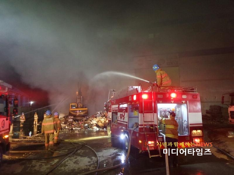 | 폐기물처리업체 화재 진압 모습. <ⓒ미디어타임즈> |