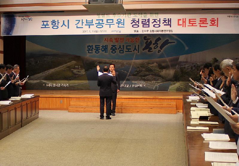 포항시가 지난 15일 시청 대회의실에서 이강덕 포항시장과 간부공무원들이 참석한 가운데 청렴의지를 높이고 역량을 결집하기 위한 ‘청령정책 토론회’를 가졌다. 올해 초부터 포항시는 외부의 객관적인 시각으로 내부구성원의 반부패 추진역량을 진단하고 분석해 청렴정책의 추진동력을 확보하고 부패관행과 조직문화를 개선하고자 「청렴성공 프로젝트」라는 이름으로 컨설팅을 진행하고 있다. 청렴컨설팅은 청렴도 향상을 위해 내부직원에 대한 설문조사와 심층면담, 지역언론인 및 시민단체 등 정책고객에 대한 현장면담, 정책자료 분석 등을 통해 다양하고 생생한 목소리를 반영하고 문제점을 진단하여 청렴정책 대안을 만드는 과정이다. 이러한 프로젝트 일환으로 열린 이번 토론회는 ‘부패제로(Zero)의 청렴한 포항’으로 나아갈 방향을 모색하기 위해 마련됐으며, 한수구 청렴사회자본연구원장의 컨설팅 진단내용과 정책제언에 이어 이강덕 시장 주재 하에 끝장토론의 형태로 진행됐다. 이날 토론회에서 참석자들은 시의 비전과 정책목표를 성공적으로 실현하기 위해서는 단기간 내에 환골탈퇴의 결의와 노력을 통해 청렴우수 기관으로 도약할 필요성 있다는 점에 대해 공감했다. 이를 위해서 반부패 역량진단을 통해 도출된 문제점을 직시하고, 간부를 비롯한 전체 구성원들의 철저한 자기반성과 함께, 본청 소속기관, 읍․면․동이 참여하는 총력 추진체계를 구축하고 전체 구성원들이 전사적(全社的)이고 결연한 자세로 변화와 혁신을 추진해 나가야 함을 결의했다. 이강덕 포항시장은 “오늘 정책토론회에서 제안한 정책과제가 단순한 제안에 그치지 않고 각 부서별로 적극적으로 추진되도록 열심히 노력하는 부서나 직원들에게 확실한 인센티브가 부여되어야 할 것”이라며 “청렴도 우수기관 도약을 올해 시정의 ‘제1의 과제’로 삼아 최선을 다해 주시길 바란다”고 당부했다. 한편, 포항시는 청렴정책의 지속적 추진과 성공을 위해 5월 29일과 6월 1일에도 전직원을 대상으로 청렴특강을 진행한다.