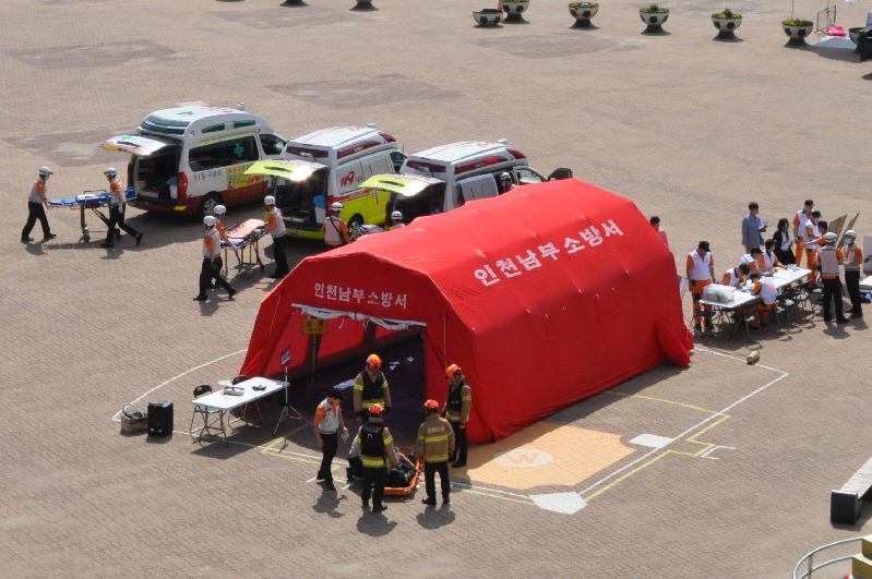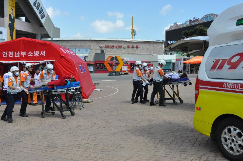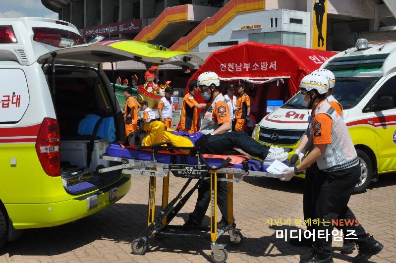[미디어타임즈=문상수 기자] 인천남부소방서(서장 김성기)는 16일 인천SK행복드림구장(남구 문학동 소재)에서 ‘2017년 다수사상자 구급대응훈련’을 실시했다.이번 훈련은 남구보건소 등 7개 기관이 참여하여 차량 12대 인원 90여명이 동원되었으며, 원인 미상에 의한 건물붕괴로 다수의 사상자 발생한 것을 가정하여 대응시스템 구축과 유관기관 간의 응원체계를 확립, 효과적인 현장대응능력을 강화하고 구급대원 병원 전 단계 대처능력을 향상시키는데 목적이 있다.훈련의 주요내용은 ▲재난발생 전파 및 선착대의 초기 응급의료소 설치 운영 ▲119구급대, 보건소 등 유관기관의 적절한 협업 활동 ▲중증도 분류, 환자의 처치 및 이송에 관한 사항 ▲현장지휘소와 현장응급의료소 간 지휘․보고체계 사항 ▲실시간 환자 이송현황 파악 ▲현장 의료인력 출입절차 등에 중점을 두고 실시하였다.소방서 관계자는 “다수 사상자 발생대비 구급대응 훈련을 통해 각종 재난, 사고 발생 시 유관기관 역할분담과 공조체계를 점검하여, 신속하고 효율적인 구급대응체계를 구축해 시민의 생명과 안전을 지키는데 더 노력해 나갈 것”이라고 말했다