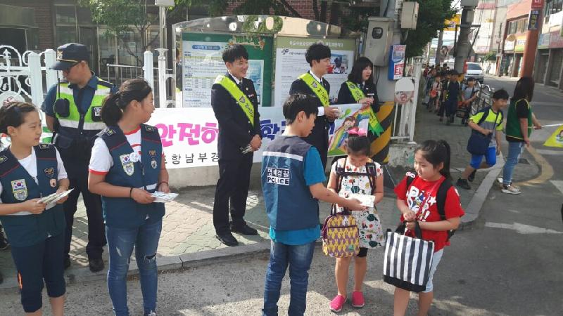 포항남부경찰서(서장 오동석)는 2017. 5. 23. 포항시 남구 연일초등학교 앞에서 명예경찰소년단 10명, 여성청소년계장, 학교전담 경찰관 4명, 녹색어머니회 2명, 교사3명 등 총 20명이 저학년 학생들을 대상으로 홍보물품 배부 등 학교폭력예방 및 교통지도 활동을 펼쳤다. 명예경찰소년단이란 초등학교 5~6학년을 중심으로 학생들에게 경찰업무 체험 및 범죄예방교육을 통해 경찰에 대한 이해도를 높이고, 준법정신 및 기초질서 의식을 함양하는 프로그램으로 포항남부경찰서에서는 지난 4월 발대식을 가진바 있다. 이날 연일초등학교 명예경찰소년단 김혜미 학생(6학년,여)은 “명예경찰소년단 활동을 통해 저학년 동생들의 안전한 등교를 도울 수 있어서 뿌듯했고 앞으로도 명예경찰소년단원으로써 학교폭력 예방활동에도 앞장서겠다.”는 포부도 밝혔다.