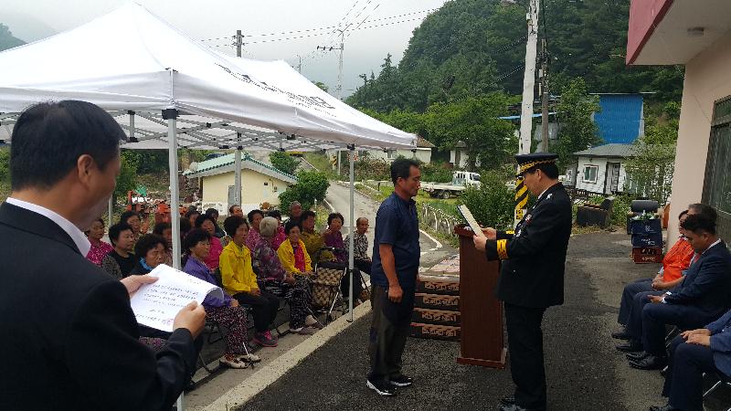 이날 행사는 기일리 마을회관에서 진해되었으며 기일리 김동원 이장을 비롯하여 약 60여명의 마을주민이 참석하였으며, 포항북부소방서는 김동원회장에게 명예소방관 증서를 전달하고 주민들을 대상으로 소화기 사용법과 화재감지기 사용설명 등 화재방교육 등을 실시했다.