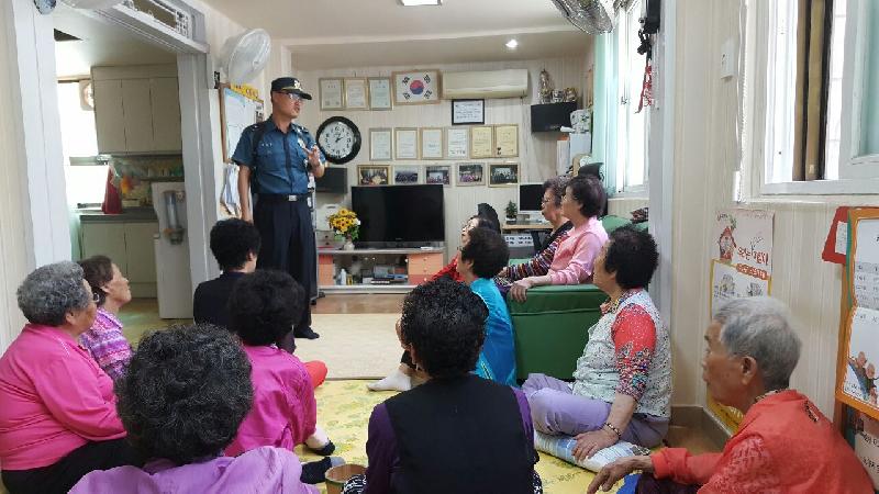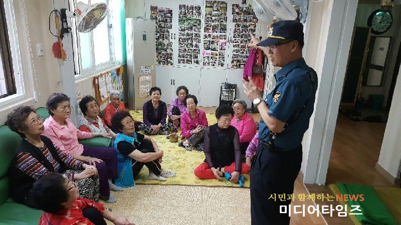 | 송현주공아파트 경로당 방문하여 사이버반칙행위인 보이스피싱 예방교육을 하는모습. <ⓒ미디어타임즈> |