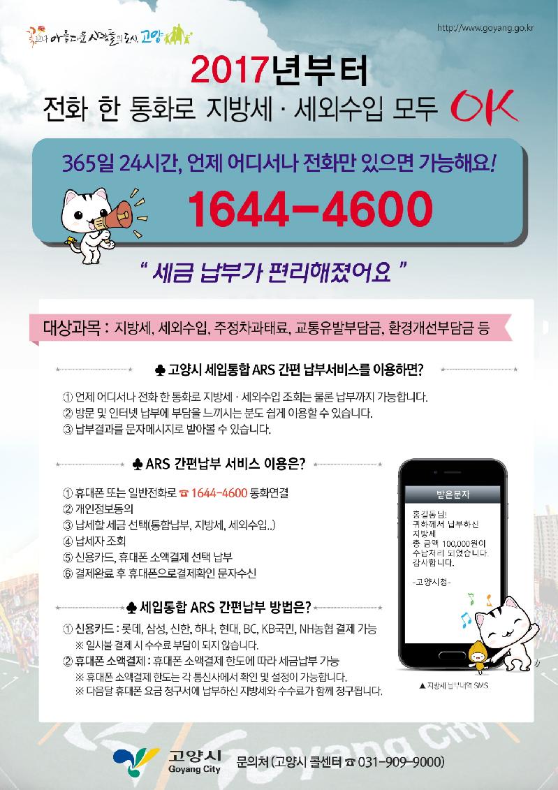 [미디어타임즈= 신정식 기자] 고양시(시장 최성)는 오늘 6월 1일부터 기존의 지방세 ARS 간편납부시스템(☎1644-4600)을 ▲주정차과태료 ▲환경개선부담금 ▲교통유발부담금 ▲상하수도요금까지 납부할 수 있도록 ‘세입통합 ARS 간편납부시스템’으로 확대 운영한다고 밝혔다.
