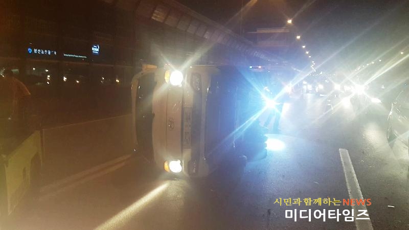 | 고속도로 교통사고 차량 전도..1명 구조 현장. <ⓒ미디어타임즈> |