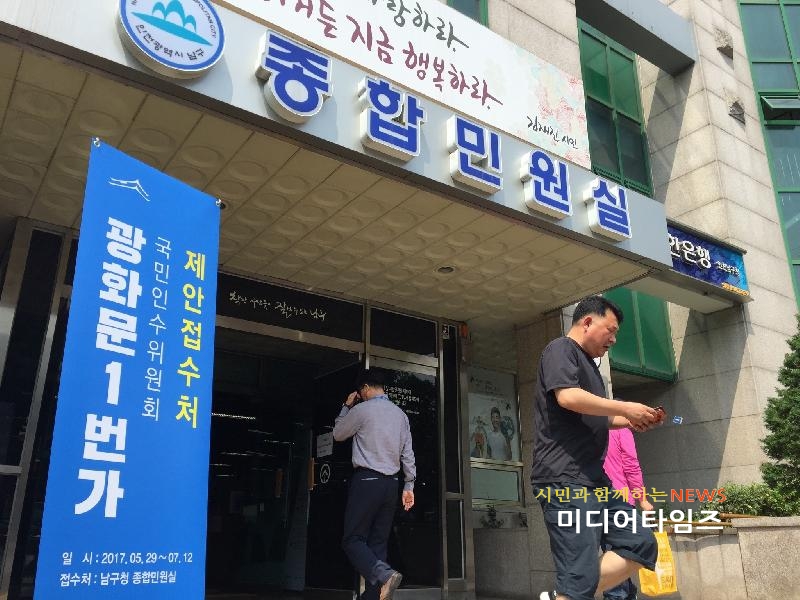 [미디어타임즈=문상수 기자] 인천 남구(구청장 박우섭)는 국민과의 소통을 강조한 문재인 정부의 ‘광화문1번가 국민인수위원회’ 제안 접수 창구를 종합민원실에 설치했다.광화문1번가 제안 접수 창구는 오는 7월12일까지 운영될 예정이다.창구는 새 정부 국정 운영에 국민의 참여·소통의 기회를 제공하기 위해 국민들의 정책제안 등 의견을 접수, 국민인수위원회에 전달하는 역할을 하게 된다.접수된 제안은 국민인수위원회 사무국으로 발송, 국민인수위에서 내용을 검토해 제안 내용중 중요 정책 반영 건의 경우 정책에 반영되며, 즉시 해결이 필요한 사항은 소관 기관으로 재분류돼 처리된다.참여는 남구청에서 운영하는 국민인수위원회 제안 접수 창구와 광화문1번가 홈페이지(www.gwanghwamoon1st.go.kr) 또는 콜센터(☎ 02-6006-5005) 등을 통해 가능하다.구 관계자는 “종합민원실에 설치된 국민인수위원회 제안 접수 창구를 통해 구민들의 참신한 정책 제안이 많이 접수돼 새 정부 정책에 반영되기를 바란다”고 말했다.