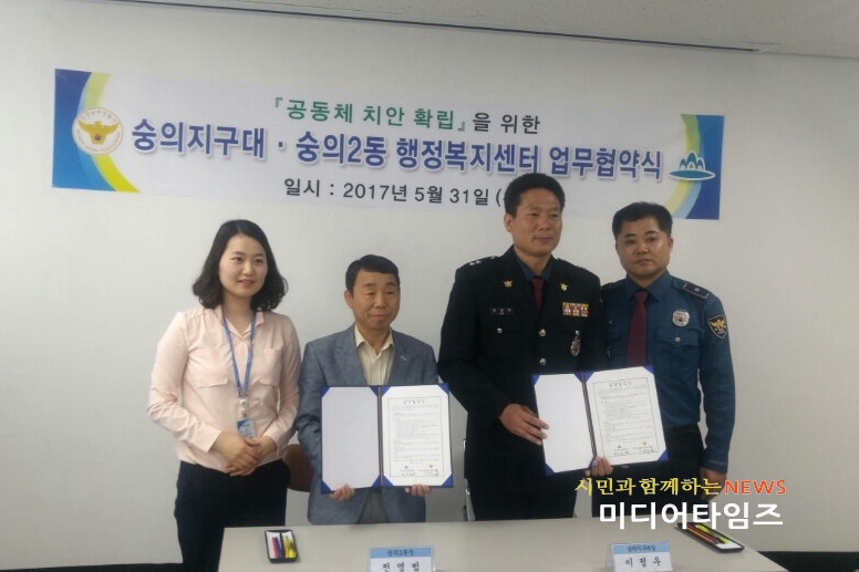 | 남부경찰서 숭의지구대와 범죄 없는 마을을 만들기 위한 업무협약을 체결모습. <ⓒ미디어타임즈> |
