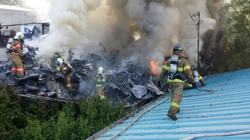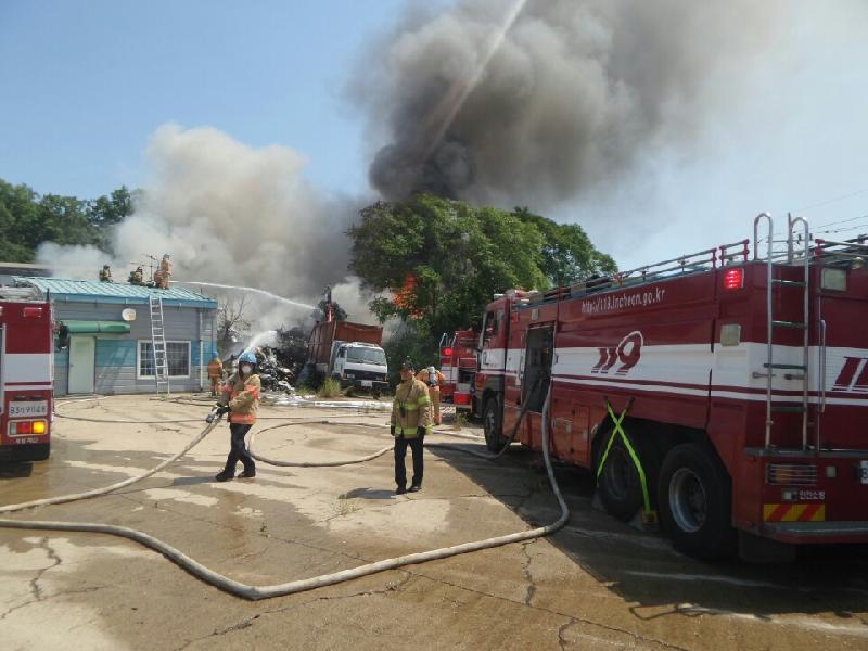 [미디어타임즈=문상수 기자] 인천서부소방서(서장 김준태)는 2일 오전 09:30분경 서구 왕길동 소재 박모씨(56세)가 운영하는 J고물상 야적장 외부 에서 원인을 알 수 없는 화재가 발생하여, 재활용 고철을 비롯해 비철, 컨테이너, 폐타이어 분쇄기등이 불에 타 소방서 추산 450여만원의 재산피해를 내고 인명피해 없이 1시간만에 진압되었다고 밝혔다.해당 고물상 야적장에는 폐기물과 인화성물질이 뒤섞여 유독성가스가 분출되는 가운데, 이른 무더위 속에 소방대원들이 진화작업을 벌이는데 어려움을 겪었다. 서부소방서는 신속한 화재진압을 위해 소방차량 19대 인원 53명,검단의용소방대 20명이 동원되었으며, 정확한 화재원인 규명을 위해 조사 중 이다.