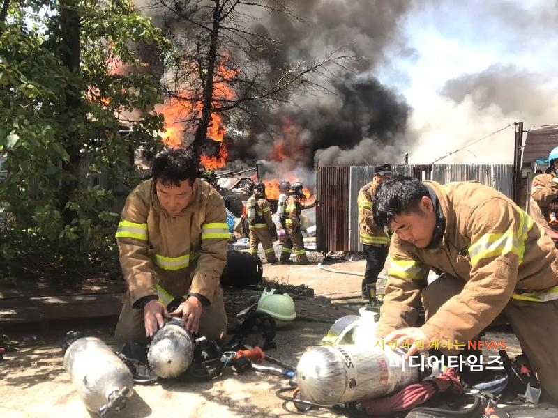 | 인천서부소방서 왕길동 고물상 화재 신속한 진압모습. <ⓒ미디어타임즈> |