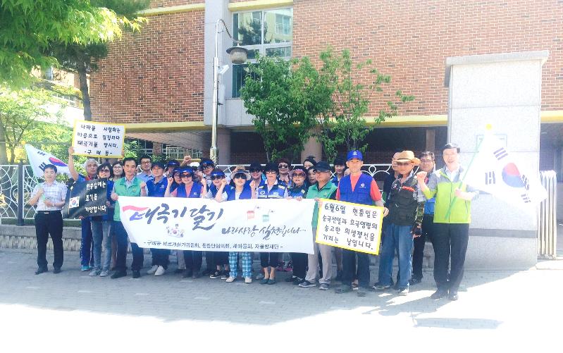 [미디어타임즈= 이영희 기자] 제62회 현충일을 앞두고 지난 2일 순국선열과 호국영령의 숭고한 희생 정신을 기리고, 시민들의 애국심을 고취시키자는 취지로 바르게살기위원회, 통장단협의회, 새마을회, 자율방재단 회원 등 구래동 사회단체회원 30여명이 나라사랑 태극기달기 캠페인을 벌였다. .