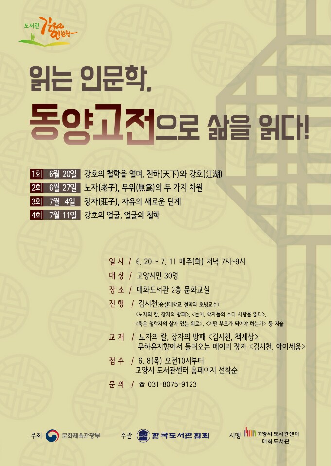 한편 그 첫 시작의 문을 열 ‘읽는 인문학, 동양고전으로 삶을 읽다’는 오는 20일부터 7월 11일까지 매주 화요일 저녁 7시 4주에 걸쳐 대화도서관 문화교실에서 열린다. 김시천 숭실대 철학과 초빙교수의 진행으로 ‘노자의 칼, 장자의 방패’ 주제 도서를 읽고 노자와 장자 의 사상을 통해 역사와 현실, 오늘날 삶의 경험과 의미를 보다 구체적이며 새로운 시각으로 바라보는 시간이 될 것이다.