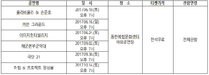 온가족이 함께 즐길 수 있는 부담 없고 다채로운 공연들로 풍성한 문화생활을 즐길 수 있는 기회를 선사하는 는 6월 10일, 6월 18일, 6월 24일 저녁 7시 동탄복합문화센터 야외공연장에서 진행된다.