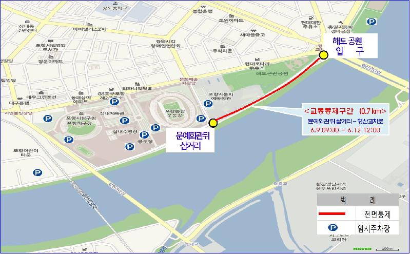 포항시는 오는 9일부터 12일까지 4일간 열리는 시승격 68주년 기념!『2017 포항시민 화합 한마당 축제』 및 『2017 포항 해병대 문화 축제』에 많은 해병대와 시민이 행사장을 찾을 것으로 예상됨에 따라 원활한 교통소통을 위해 교통대책에 총력을 기울인다. 이번 행사는 50여만명의 해병대 및 시민 등이 행사장에 운집할 것으로 예상되며 시는 행사 기간 중 교통불편 사항이 최소화 되도록 교통소통대책 계획을 수립 운영한다. 이에 따라 행사장 주변과 주요교차로에 교통질서 근무인원 297명으로 공무원과 경찰 81명, 포항시해병대전우회 176명, 포항남부모범운전자회 20명, 포항시새마을교통봉사대 20명 등 216명의 자원봉사를 지원받아 행사장인 해도공원 및 종합운동장 주변 주요교차로, 건널목, 주차장 등 14개소에 집중 배치할 계획이다. 또한, 행사장 차량출입을 통제하고, 자가용을 이용하는 시민들을 위해 종합운동장과 만인당, 야구장, 포항시견인차량보관소 등 임시주차장으로 차량을 유도해 주차편의를 제공하고, 행사장 주변 도로 불법주정차 차량으로 인한 교통혼잡을 초래하는 일이 없도록 교통지도 및 계도할 방침이다. 한편, 9일 오전 9시부터 12일 오전 12시까지 문화예술회관 뒤 삼거리-형산교차로구간(0.7km)은 먹거리장터, 해병대 장비전시로 인해 차량통행을 전면 금지한다. 포항시 관계자는 “원활한 교통소통을 위해 최선의 노력을 다하겠다”며, “주차공간이 부족으로 인한 교통 혼잡이 예상되는 만큼, 행사를 참관하는 시민들은 가능한 대중교통을 이용해 줄 것”을 당부했다.