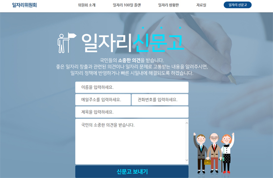 정책제안이나 민원 접수를 원하는 분들은 ‘일자리 신문고’ 홈페이지(http://www.jobs.go.kr/)에 접속해 이름, 전화번호, 메일주소와 함께 원하는 내용을 입력하면 된다.