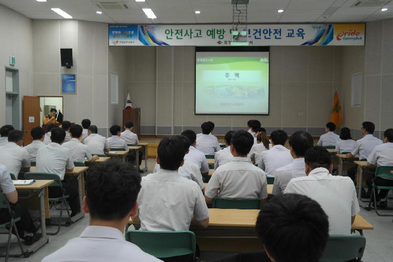 포항남부소방서(서장 은대기)는 6월 5일 현장대원들의 안전확보를 위한 현장보건안전교육을 실시하였다. 이번 교육에서는 2007년 경기도 이천 냉동공장 화재로 인한 순직 소방공무원의 사례를 통하여 각종 재난현장의 일선에서 활동하는 대원들의 안전 확보에 대한 경각심을 고취 시켰으며, 재난현장에 잠재되어 있는 수많은 안전관리의 문제점에 대하여 개선방안을 토론하는 자리가 되었다. 은대기 포항남부소방서장은 “나 자신의 안전 확보가 더 많은 도민의 생명을 보호할 수 있다는 생각을 갖고 각종 현장활동시 개인안전관리에 만전을 기해 줄 것.”을 당부하였다.