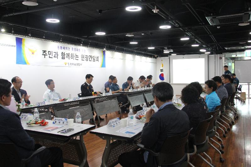 [미디어타임즈=문상수 기자] 인천 김봉운 부평경찰서장은,지난 7일 백운파출소를 방문하여 공동체 치안을 위한 주민들과의 현장간담회를 실시했다. 이 날 간담회는 부평3동 주민센터장, 자율방범대 등 협력단체장, 통장회장, 녹색어머니회장 등 주민 20여명이 참석한 가운데 부평경찰서의 치안정책 소개 후 주민 건의사항 및 토론 등을 통해 각 종 현안에 대한 개선방안을 다과를 하며 편안한 분위기에서 문답형식으로 진행했다.김봉운 경찰서장은, “사거리 내 X자 횡단보도 설치 검토”, “신호체계 변경”, “어린이 교통사고 예방을 위한 대책 마련” 등 주민들의 요구사항을 즉각 수렴하고 개선방안을 모색하는 한편, 앞으로도 부평경찰서 관내 모든 지역관서를 방문하여 주민과의 대화를 통해 공동체치안을 위해 최선을 다하겠다.”고 말했다.