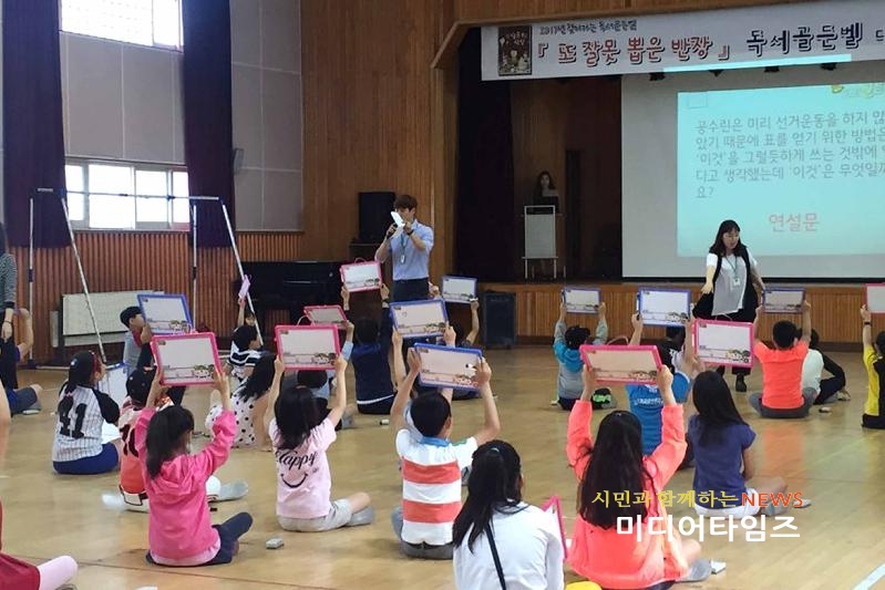 [미디어타임즈=문상수 기자] 인천 동구(구청장 이흥수) 송림도서관은, 8일 창영초등학교 학생 대상으로‘찾아가는 독서골든벨’프로그램을 운영했다.구에 따르면 이번 사업은 ‘찾아가는 도서관’사업의 일환으로 관내 초등학교와 연계한 독서 골든벨 프로그램을 운영해 공교육 협력체계를 구축할 뿐만 아니라 책 읽는 분위기를 조성해 아이들의 주도적 독서습관을 형성하고자 마련됐다. 이번 독서골든벨의 선정도서는 어쩌다 반장으로 뽑힌 소심한 소녀 공수린이 이야기를 담은‘또 잘못 뽑은 반장’이 선정돼 중학년 어린이들의 많은 공감을 이끌어냈다.이날 독서골든벨은 창영초등학교 3~4학년 학생을 대상으로 실시됐으며, 패자부활전 등의 기회 없이 40여개의 문제를 낸 끝에 최후의 우승자 3인이 남았다. 또한 골든벨 우승자 1등부터 3등 학생에게는 예쁜 선물을 증정하는 등 즐거운 시간을 가졌다.구 관계자는“앞으로도 어린이들을 대상으로 하는 재미있는 독서 관련 행사를 많이 운영해 어릴 때부터 책과 친해질 수 있는 분위기를 조성할 수 있도록 더욱 노력하겠다”고 말했다.한편 송림도서관에서는 오는 10월까지 만석초등학교를 비롯한 관내 7개 초등학교에서 독서골든벨을 진행할 예정이다.
