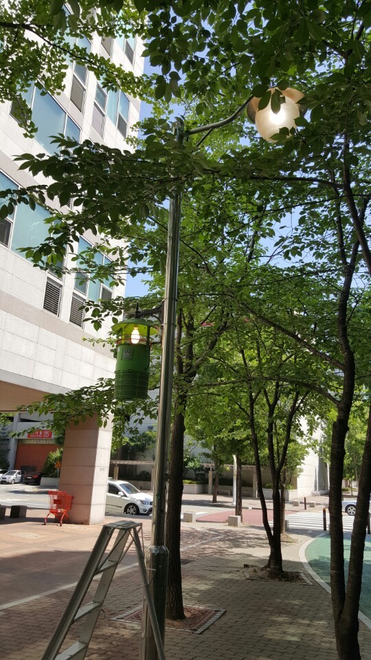 가로등에 설치된 해충 포집기는 별빛 파장으로 수목 해충을 유인ㆍ포획한 후 없애는 방제법으로, 농약을 사용하지 않아 친환경적이고 위생적이다.