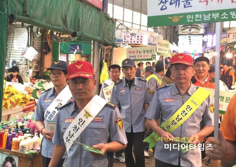 [미디어타임즈=문상수 기자]인천남부소방서(서장 김성기) 용현119안전센터에서는 9일 소방공무원 및 의용소방대원 20여명과 소방차량 3대가 동원된 가운데, 관내 전통시장인 용현시장에서 소방출동로 확보훈련을 실시했다.이번 훈련은 통로가 협소한 전통시장에 대하여 소방차가 출동할 수 있는 최소한의 통로를 확보하고 상인들과 시민들의 협조체계를 구축하기 위한 것으로, 상인들의 상품 진열 등으로 인한 통로장애 발생을 원천적으로 예방하고 화재에 대한 경각심을 고취시키는 것에 초점을 맞췄다. 또한 초기 대응능력 강화를 위해 시장 내에서 현지 상인에 의한 비상소화장치 활용 능력을 배양시키고, 화재발생 시 농연을 배기시키기 위해 설치된 천장 아케이드 개방에 대한 교육을 중점으로 상가주민들의 행동요령에 대한 교육도 병행 실시했다.소방서 관계자는 “용현시장은 통로 길이가 길기 때문에 통로가 확보되지 않는다면 대원들의 진입이 늦어져 자칫 대형 참사로 이어질 수 있으므로, 시장상인들에게 통로확보에 대한 경각심을 일깨워 자발적인 안전의식을 고취시키고 상호 협조체제를 더욱 돈독히 하여 유사시 대응능력을 강화하여 줄 것”을 당부했다.