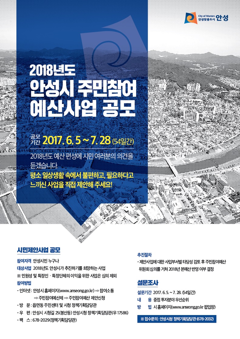 [미디어타임즈= 이영희 기자] 안성시는 2018년도 예산 편성을 위한 주민참여예산사업 공모 및 설문조사를 7월 28일까지 약 2개월간 실시한다고 밝혔다.