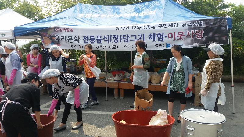 이번 장 담그기는 초평회(새마을부녀회원과 관내 지역주민 등 30여명)가 2017년 따복공동체 주민제안 공모사업에 공동체 활동의 일환으로 신청하여 선정된 사업이다.