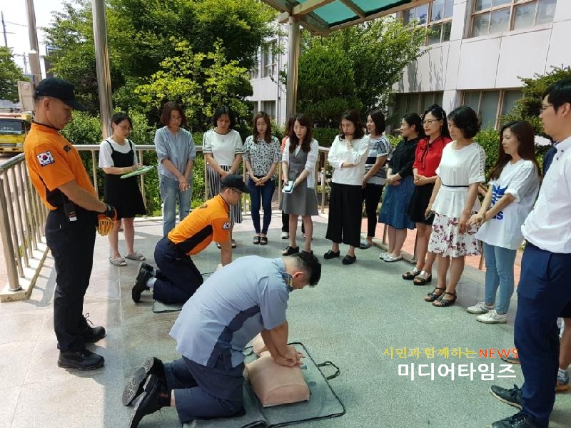 [미디어타임즈=문상수 기자] 인천서부소방서(서장 김준태) 가좌119안전센터는 지난13일 오후 13시부터 약 한 시간동안 건지초등학교 교사 및 학생 370명을 대상으로 소방훈련 및 교육을 실시했다. 이번 훈련은 건지초등학교 2층 인재 융합실에서 화재가 발생한 상황을 가정하여 실시하였으며, 학교 자위소방대원들의 유도에 따라 학생들은 낮은 자세를 취하고 수건이나 마스크로 코와 입을 막은 후, 비상구를 이용하여 운동장으로 신속하고 안전하게 대피하였다. 학생들의 대피가 이루어지고 난 뒤에는 학교 자위소방대 진압반과 복구반에 의하여, 화재를 안전하게 진화하는 것으로 훈련은 종료되었다. 훈련을 마친 후, 가좌119안전센터 센터장(소방경 강순석)의 훈련 강평과 함께 ▲ 옥내소화전 사용요령 ▲ 소화기 사용방법 ▲ CPR(심폐소생술) 요령등의 순으로 진행되었다. 특히 CPR(심폐소생술) 교육의 경우, CPR강사 자격증 소지자인 가좌의용소방대 황준철 부대장이 구급대원들과 학생들을 위해 심폐소생술 강사로 나서 소방안전교육을 실시하였다.