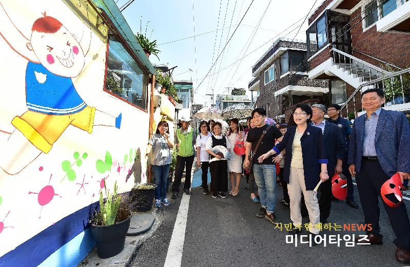 [미디어타임즈=문상수 기자] 인천부평구는 ‘여성이 편안한 발걸음 500보’ 산곡3동 사업을 마무리하고 지난14일 오후 홍미영 부평구청장과 구의원, 지역주민 등이 참여한 가운데 사업지 일대에서 현장 모니터링을 했다. 이 사업은 ‘누구라도 행복한 소통과 배려의 여성친화도시 부평’ 조성을 위한 것으로, 마을 버스정류장이나 공공기관으로부터 동네 어귀가 대략 500보 정도인 점을 감안, 이 거리의 골목길에 안전 및 친환경적인 요소를 도입해 주변을 개선하는 프로그램이다.산곡3동에서는 2016~2017년 2년에 걸쳐 ‘도심 속 전원주거지 산곡전원마을’이란 주제로 인천가톨릭대 환경디자인과(지도교수 이승지) 학생들의 디자인 고안과 마을 주민들의 적극적인 참여로 마을 개선작업을 벌였다.마을 주민들이 직접 담장을 밝은 색 페인트로 도색하고, ‘희망그리기’라는 단체에서 자원봉사로 마을 콘셉트인 전원마을에 어울리는 그림을 마을 곳곳 담장에 그려 넣어 동네 분위기를 산뜻하게 바꿔 놓았다. 주민들 간 소통 강화를 위해 화단 및 쉼터를 조성하고, CCTV·비상벨을 설치하는 등 마을 방범시스템도 강화했다.이날 모니터링에는 부평구 아동·여성 안전 지역연대 위원, 여성친화 서포터즈 등도 참석, 사업이 완료된 현장을 살펴본 뒤, 그간의 성과를 공유했다.홍미영 구청장은 “이번 사업으로 마을이 좀 더 안전해지고, 이웃끼리 소통하는 활기찬 마을이 된 거 같아 기쁘다. 관 주도 행사가 아니고 지역주민들이 함께 참여해 직접 만들어가는 사업이라는 점에서 의미가 크다”며 “앞으로도 부평구 전역에 주민 스스로 마을을 가꾸는 문화가 전파되길 희망한다”고 밝혔다.부평구는 올 사업지로 십정1동을 선정했으며, 7월 중 디자인보고회를 가진 뒤 8월 주민설명회를 거쳐 하반기에 본격적인 마을 개선작업을 추진할 계획이다.