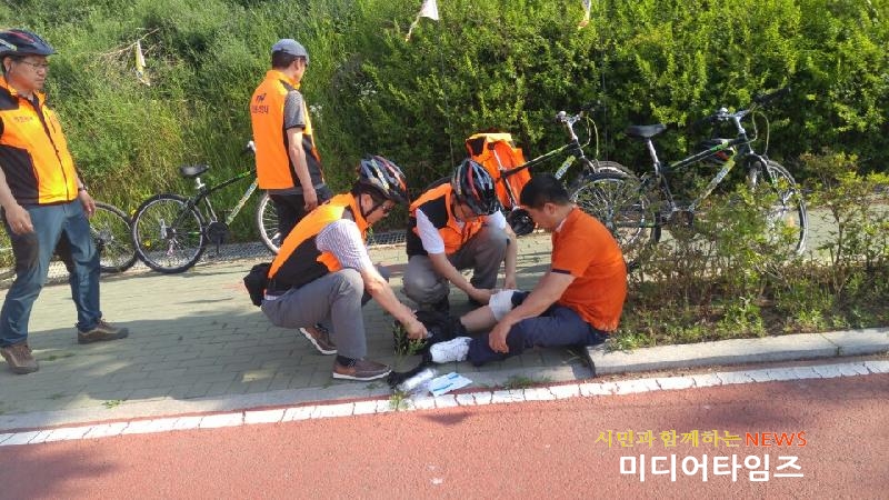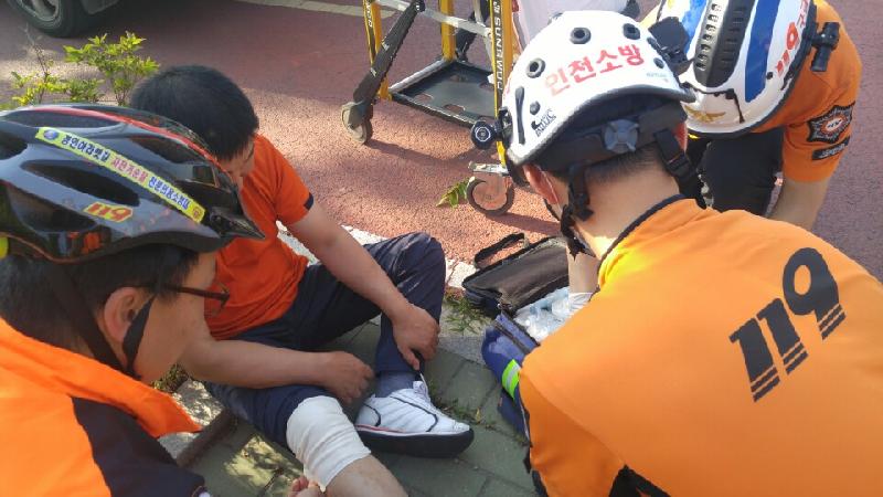 [미디어타임즈=문상수 기자] 인천서부소방서(서장 김준태)는 경인아라뱃길 자전거순찰 전문의용소방대는 지난14일 오후 14시에 경인아라뱃길 자전거도로 순찰 도중 자전거에서 넘어져 부상을 입은 환자를 발견하여 신속한 응급처치를 실시한 후 검암구급대에 인계했다고 전했다.요구조자(강 모씨, 남, 58세)는 자전거를 타던 중 마주오던 자전거를 피하다 넘어지면서 오른쪽무릎과 정강이부분이 땅에 부딪쳐 통증을 호소하고 있었고, 마침 순찰하고 있던 검암전문의용소방대원이 이를 발견해 119에 신고 후 상처부위 소독, 응급처치를 하는 등 부상당한 시민을 안정시켰다.이기영 의용소방대장은“자전거를 이용하는 분들도 자전거도로라 하여 무조건 안전하다고 믿기 보단 안전장비를 반드시 착용하고 안전사고에 주의를 기울여야 한다.”며“안전사각지대의 파수꾼으로 불의의 사고에 즉시 대처하는 든든한 안전지침이 역할을 할 것을 약속드린다”라고 전했다.