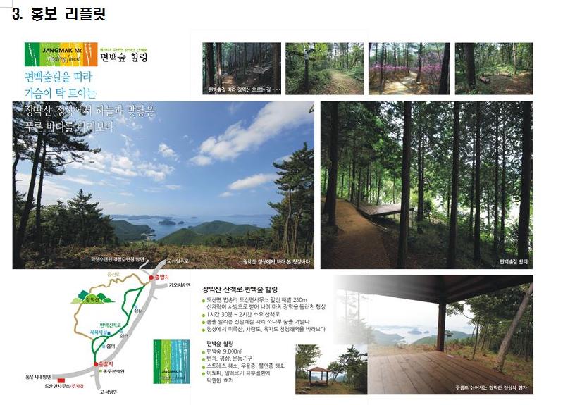 또한 주변에 우후죽순으로 불량하게 흐트러진 간판들을 통합지주형으로 정비하고, 도산면사무소 주변도로에 장막산 산책로 및 편백숲 힐링 안내 배너를 설치하여 친환경적인 거리를 조성하였으며, 향후 장막산과 편백숲 홍보 리플릿을 제작하여 관내 각급 기관․단체, 기업체 등에 배부할 계획이다.