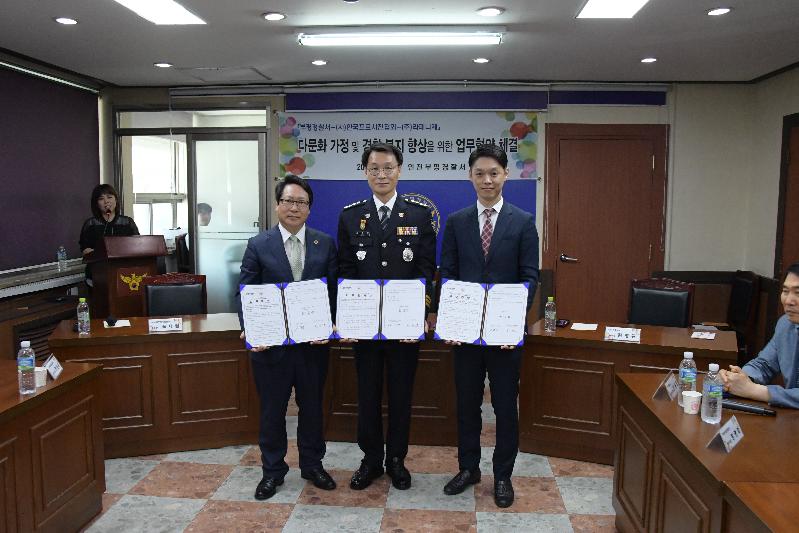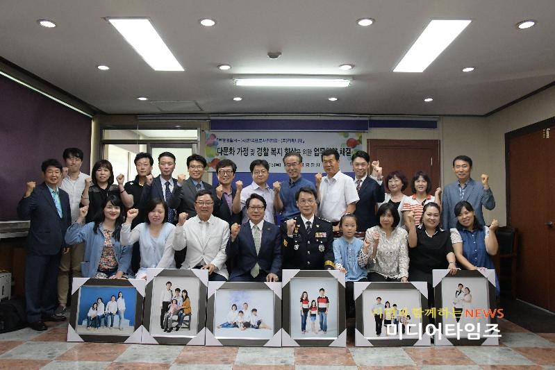 [미디어타임즈=문상수 기자] 인천부평경찰서(서장 김봉운)는,지난 15일 (사)한국프로사진협회와 ㈜라페니체 등 3개 기관이 함께 다문화 가정의 안정적 사회정착과 경찰 복지 향상을 위해 업무협약(MOU)을 체결하였다.이번 협약식에서는 (사)한국프로사진협회(프로사진 봉사단)의 재능기부와 ㈜라페니체의 지원을 통해 촬영한 가족사진 및 뷔페 식사권을 다문화 가정 6가구에 전달하였다.이번 협약은 (사)한국프로사진협회에서 연 2회 선발된 다문화 가정에게 리마인드 웨딩 및 가족사진을, ㈜라페니체에서는 뷔페 식사권을 무상 제공한다.또한, 경찰 복지향상을 위해 인천지방경찰청 소속 의무경찰에게 가족사진(5x7inch) 2장을 재능기부하며, 경찰공무원 결혼식 계약자 대상 결혼식장 뷔페 총 비용의 5%할인 서비스를 제공한다.김봉운 부평경찰서장은 “경찰과 민간에서 주관하는 이번 협약을 통해 다문화 가정이 우리 국민으로서 사회에 보다 나은 방향으로 적응해 나갈 수 있도록 앞으로도 지속적으로 노력할 것.”이라고 밝혔다.