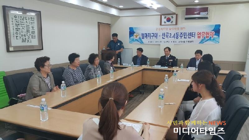 [미디어타임즈=문상수 기자] 부평경찰서 철마지구대장(경감 박기현)은지난 15일(목) 산곡2동 주민센터에서 철마지구대장, 산곡2・4동장, 통· 반장 등 15여명이 참석한 가운데 관내 공감치안활동 활성화를 위한 업무협약을 체결하였다. 주요협약 내용은 △범죄로부터 안전한 부평 만들기에 상호협력 △치안요소, 지리적 특성 분석을 통한 맞춤형 주민 안전방안 강구 △ 사회적 약자 복지에 대한 유기적 협조 △ 본 협약 상 공동의 목적을 달성하기 위한 상호협력시스템 구축 등 이다.이날 협약으로 지구대와 주민센터 상호간 협력체제를 한층 더 강화해 공동체 치안활동 활성화와 범죄예방을 위한 홍보활동 참여 등 상호 유기적 협력 및 교류활성화를 통한 지역주민 중심의 치안서비스 활동을 할 수 있는 계기가 되었다고 밝혔다.박기현 철마지구대장은“민·관·경이 함께하여 인천에서 가장 안전하고 여성이 마음 놓고 다닐 수 있는 환경을 만들어 지역주민들의 행복한 생활이 유지 될 수 있도록 양질의 치안서비스를 제공 하겠다”고 하였다.