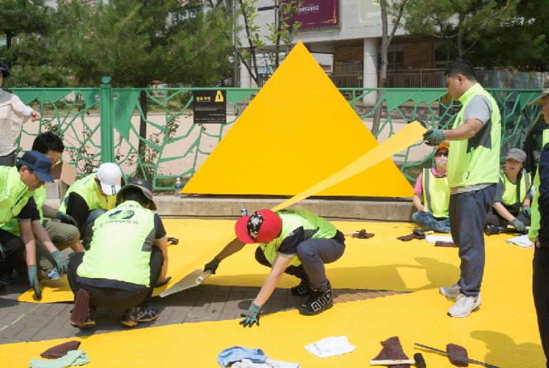 | 서구 ‘2017년 아동이 안전한 마을 만들기 옐로카펫·노란발자국 설치’ 모습.<ⓒ미디어타임즈> |