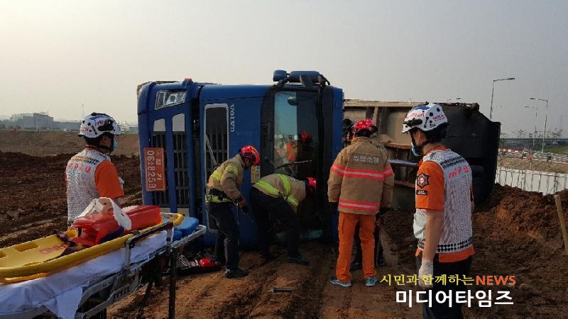 | 인천서부소방서, 25t 덤프트럭 전복사고 구조 모습.<ⓒ미디어타임즈> |